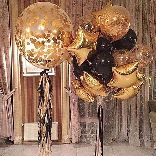 Букет из 6 золотых звезд, 5 шаров с золотым конфетти и 8 черными шарами