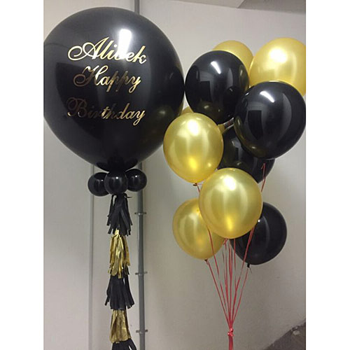 Большой черный шар с индивидуальной надписью и черно-золотой гирляндой тассел.