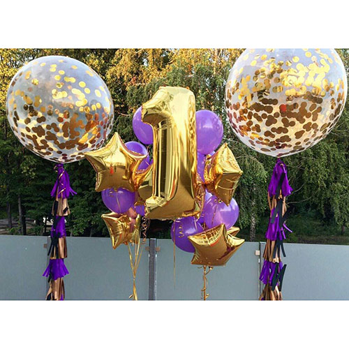 2 фонтана из 2 золотых звезд и 6 лиловых шаров.