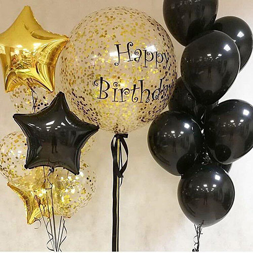 Фонтан из 2 золотых, 1 черной звезды и 4 шаров с золотым конфетти.