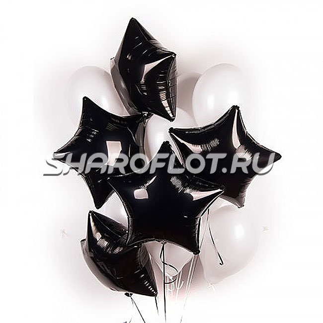 Состав букета 5 черных звезд, 10 латексных белых шаров.