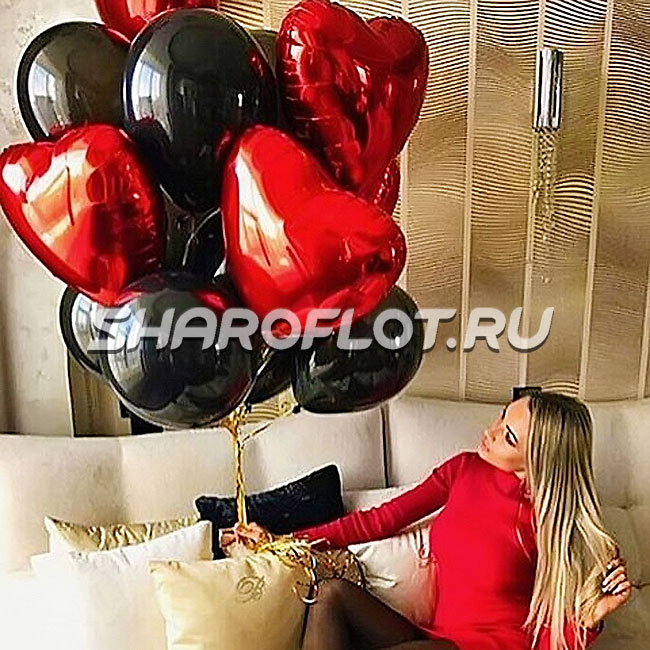 Состав букета: 7 фольгированных красных сердец 45см, 10 черных шаров 30см<br /><br /><br />