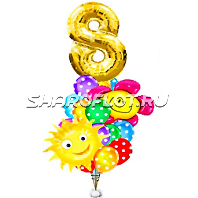 Шарики в горох, солнце, цветочек, а также золотая цифра года рождения создает то самое детское радостное настроение беззаботности и праздника! Если у вашего малыша или малышки день рождения, то этот букет вам определенно подойдет!<br /><br /><br />