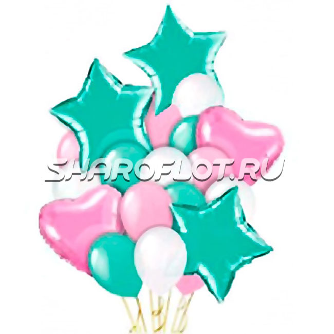 Состав букета: 3 звезды, 2 сердца, 15 латексных шаров в цветах белый, розовый, мятный.<br /><br /><br />