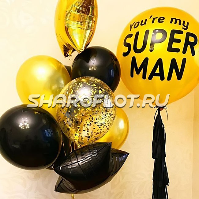 Фонтан из черной и золотой звезды, 1 шара с конфетти, 2 золотыми и 3 черными шарами.