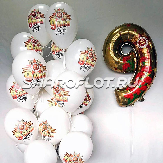 Фонтан из белых шаров и цифры к 9 мая