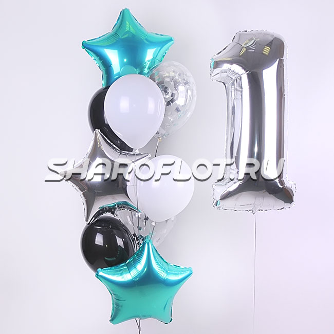 1 любая серебряная фольгированная цифра с гелием, 102 см;
