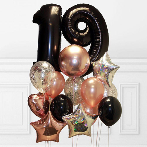 Крутая композиция из черных и цвета розовое золото шаров.
