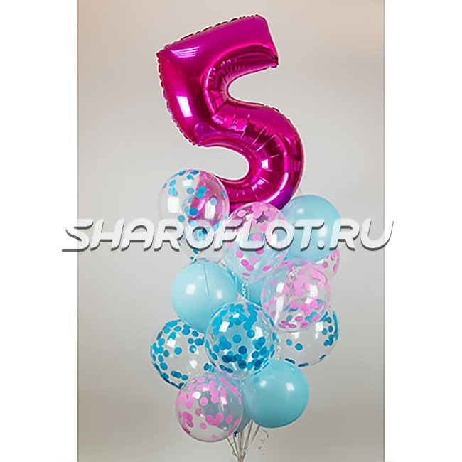 Милый букет из шаров с цифрой в цветах фуксия-голубой.
