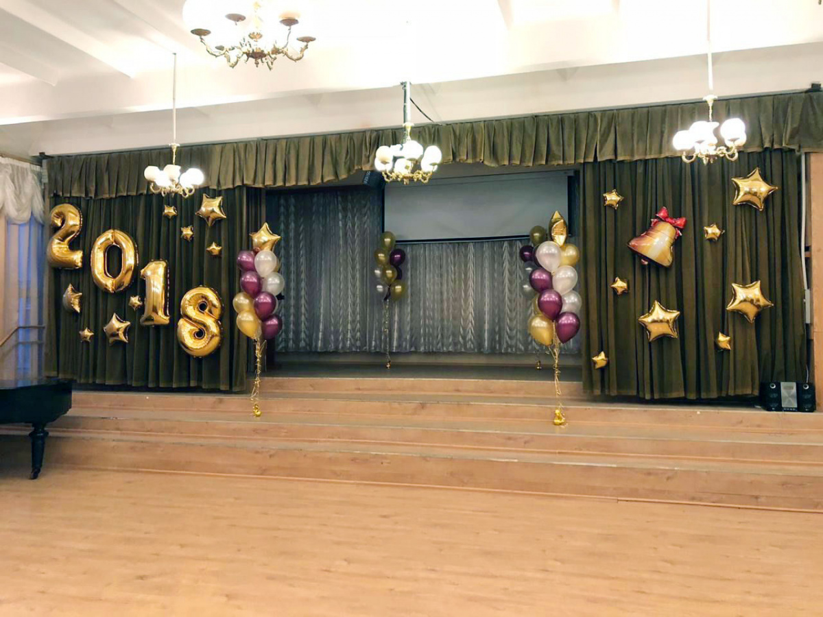 В составе оформления: фольгированные цифры (1м) 4 шт, фольгированные звезды (45см) 6 шт, фольгированные звезды (20см) 10 шт, фольгированный фигурный шар колокольчик (77Х58см), фонтаны из шаров с гелием 2 шт (по 12 латексных шаров с гелием и 1 фольгированной звезде 45см в каждом), фонтаны из шаров с гелием 2 шт (по 10 латексных шаров с гелием в каждом)