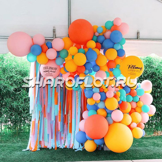Летняя фотозона высотой около 3 метров. В стоимость входит оформление шарами + дождик на фоне слева.