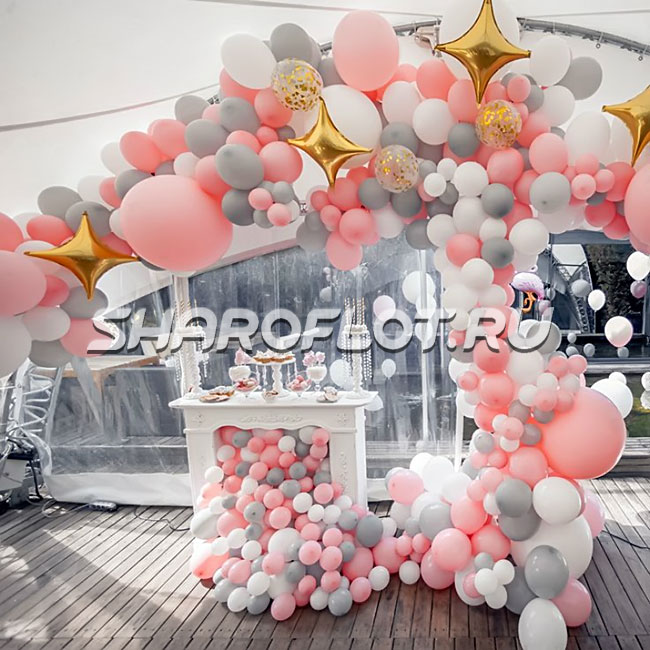 Стоимость указана только за гирлянду из воздушных шаров как на фото, с учетом простого монтажа в рабочее время. Дополнительный декор гирлянды согласовывается отдельно с клиентом.