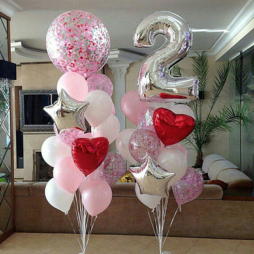 1 серебряная цифра, 4 шарами с серебряным конфетти, серебряной звездой, красным сердцем, 5 розовыми и 5 белыми шарами.