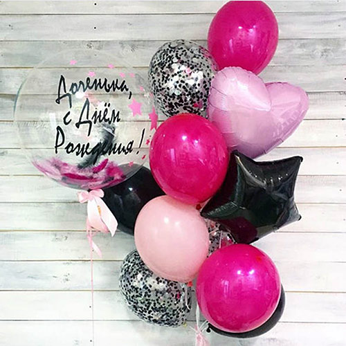 1 черная звезда, 1 розовое сердце, 3 шара фуксия, 2 розовых шара и 3 шара с черным конфетти.