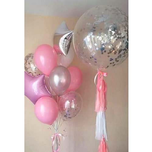 Большой прозрачный шар с серебряным конфетти и гирляндой тассел, 1 серебряная звезда, 1 розовая звезда, 3 розовых шара, 2 белых шара, 1 серебряный шар, 2 шара с серебряным конфетти.