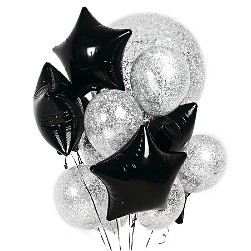 Красивый праздничный букет с конфетти в черно-серебряном цвете.